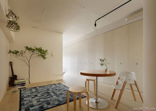 Các kiến trúc sư đã giấu hệ tủ kệ, bếp, tủ lạnh... phía sau cánh cửa kéo. Những người thiết kế đã lấy cảm hứng từ bức vách Byobu truyền thống của Nhật.