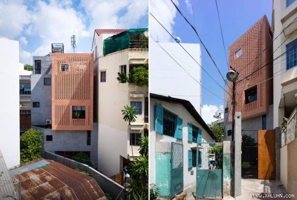 Mặt tiền sử dụng mô tuýp gạch xếp lỗ quen thuộc của công ty kiến trúc Tropical Space. Các KTS tạo ra những ô trống cho phép nhà vừa riêng tư vừa có được những góc nhìn chọn lọc.