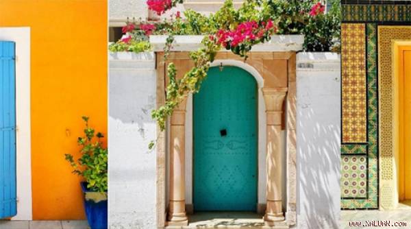 | Cánh cửa được chạm khắc tinh tế với màu xanh được sử dụng phổ biến trong các công trình ở Tunisia. |