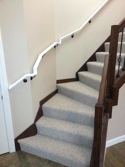 Cầu thang được trải thảm ấm áp, có lan can, ốp gỗ ở chân tường. Tuy nhiên, bạn dễ gặp nguy hiểm khi lưu thông trong nhà.