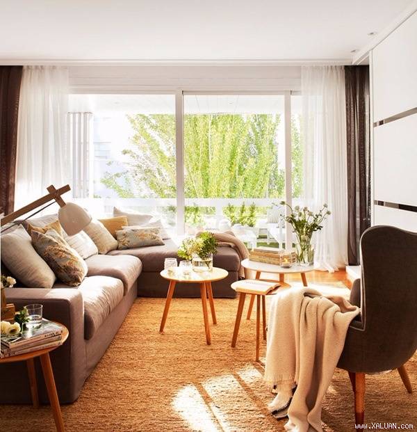 Tấm thảm trải sàn màu đất kết hợp hài hòa với bộ sofa màu ghi để tạo nên mảng màu đối lập với tường và trần màu trắng. Và dù căn phòng có diện tích khá hạn chế nhưng vẫn đủ để mang lại nét đẹp tinh tế, hài hòa, nhuốm đầy sắc thu.